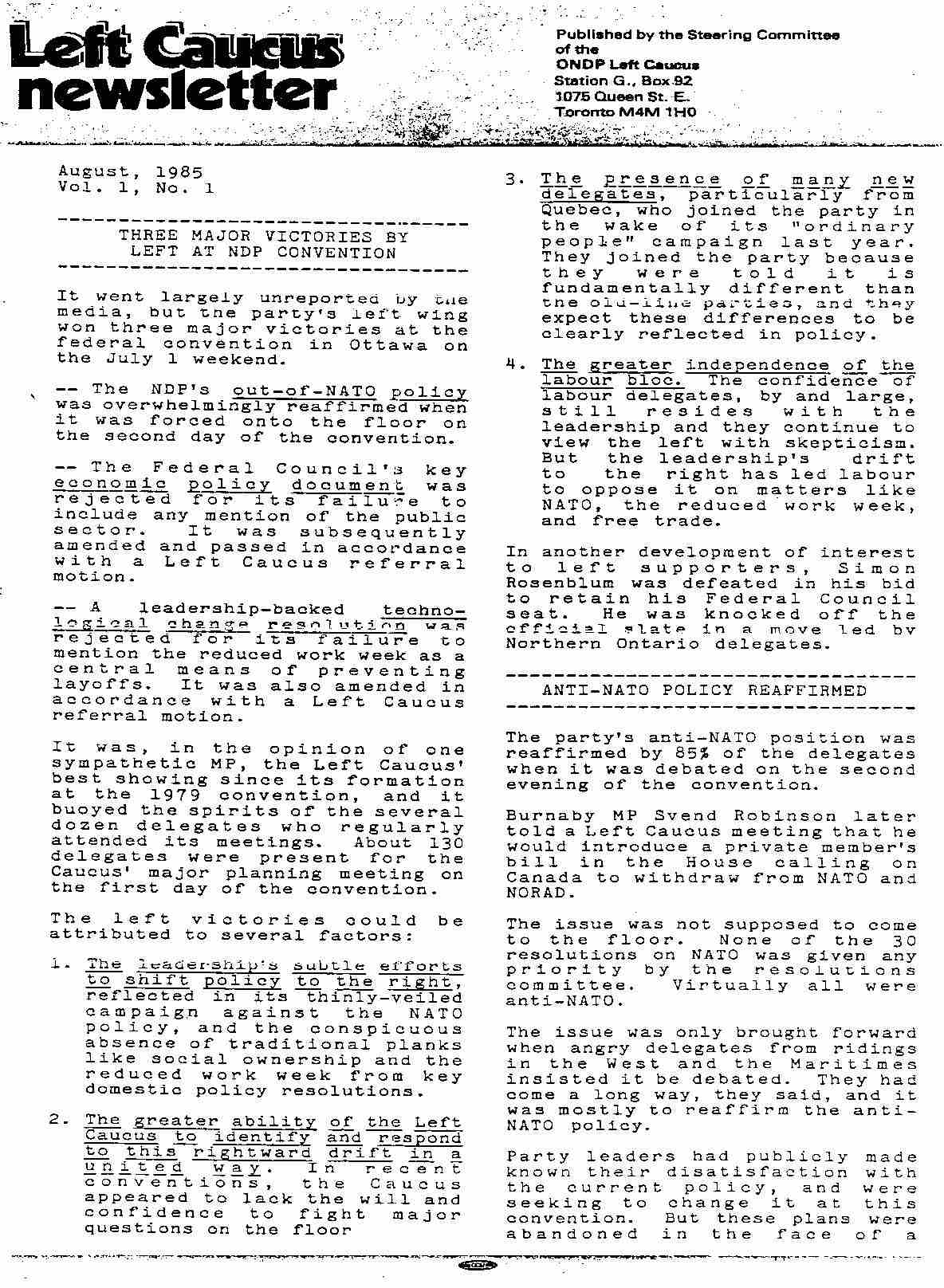 | 1985Aug-1-1 | LC News Vol. 1 No. 1 Three major victories by the left at NDP Convention; Anti-NATO policy reaffirmed |