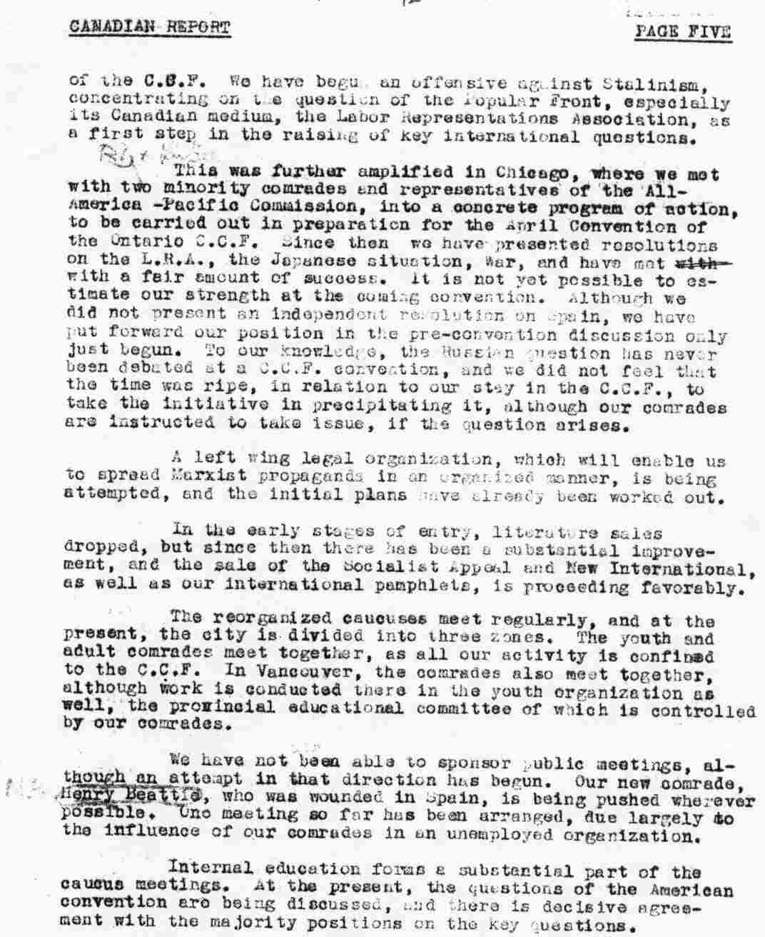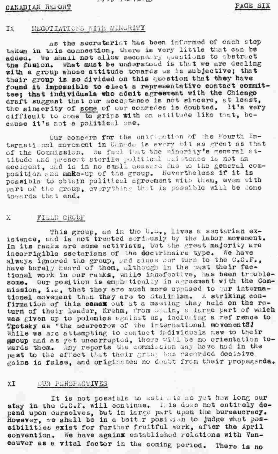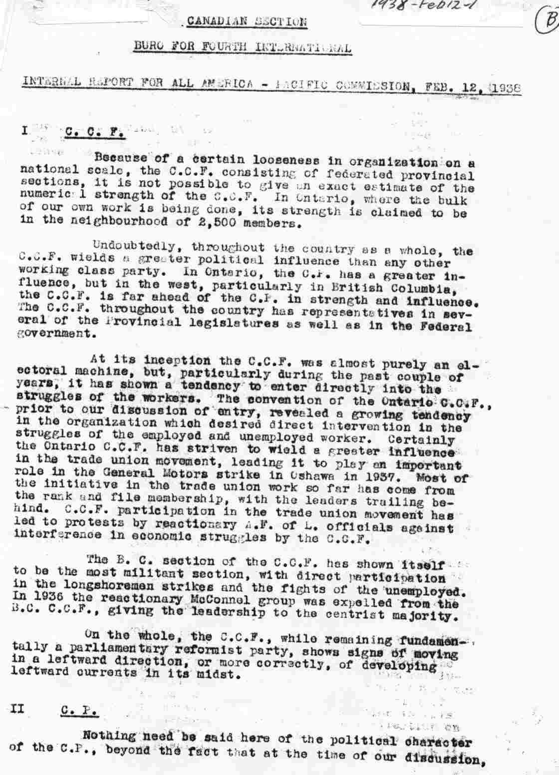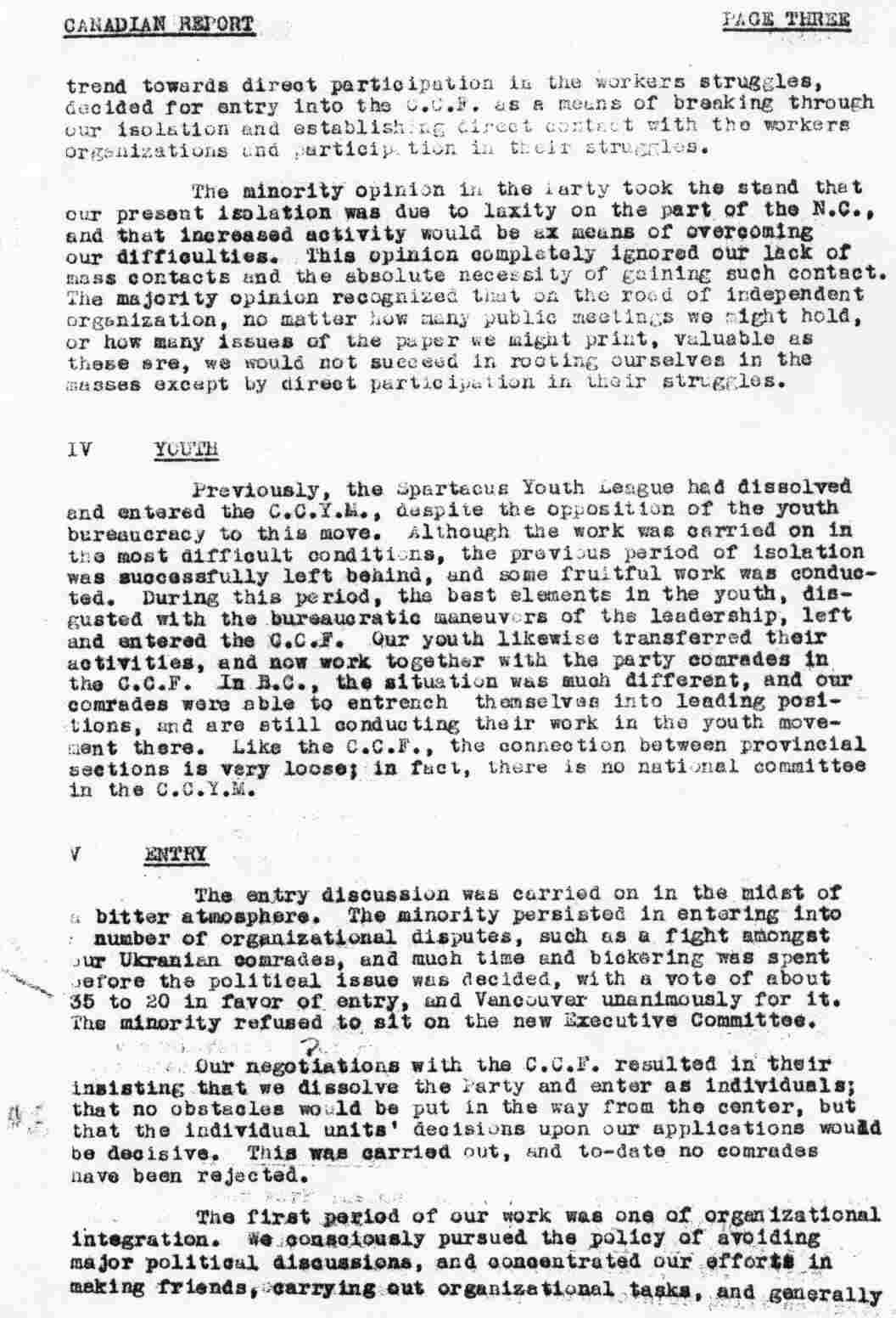 The C.C.F., while outwardly stable, is composed largely of raw and uninitiated elements. While in Ontario its composition is overwhelmingly petty-bourgeois, there is a sufficiently large proletarian core to make our work worthwhile. Movements and splits have developed within its ranks regularly. These have been corrupted, (have) disintegrated and to some extent swallowed up by Stalinism, partly because of our own weakness, and also because of our isolation. We do not look forward to any great gains, but the entry experience will strengthen our movement greatly. Closer ties with the Commission will compensate in some measure for our young and inexperienced leadership.