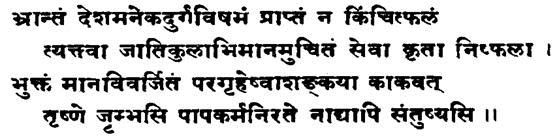 "I wandered through difficult mountainous territory quite fruitlessly, rendered service after jettisoning proper pride of class and family-unrewarded; with a complete abandon of self- respect, I ate in strangers' houses with the timidity of a crow (picking up scraps); and thou, o sin-loving greed, waxest and art not yet satisfied."