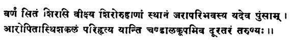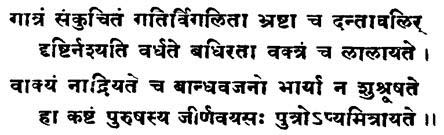 "The body is contracted, the gait totters, teeth fall out, eye sight is lost, deafness increases, and the mouth slobbers. Relatives no longer respect one's utterance, one's wife neglects her care; alas for the travails of old age when even the son becomes unfriendly (V.74). On seeing white hair on the head, the white hag of a man's surrender to old age, the girls avoid you from afar as they would a well for untouchables marked by its bundle of (bleached) bones (hung on top as a warning)" (V. 75). All these sentiments ring painfully true but, as means of inspiring renunciation, rather ignoble. Even that most thoroughgoing of rakes, Casanova, took old age more gracefully than this.