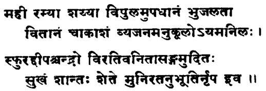 "If, before you, you have the songs of accomplised southern poets and behind you tbe tinkle of ornaments worn by whisk-bearing attendant, maidens, then be a glutton for worldly pleasures; but if yon haven't these things, o mind, hasten to enter into undisturbed contemplation". That is if you are a king and can make a good thing of it, carry on; otherwise, give up the pleasures of the world which are beyond your reach. At the very least, this should dispose of the legend that Bhartrihari actully was a king; one feels that he would have taken his own advice and carried on.