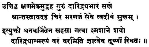 Yet, the picture so far is not only incomplete, it is actually false to the poet's own sentiments. One stanza breaks with quite incredible force through the general impression hitherto produced to give the unbiassed reader a profound if brief glimpse of the truth usually missed by professional critics and litterateurs, true but not very worthy members of Bhartrihari's own class. (V.22: )