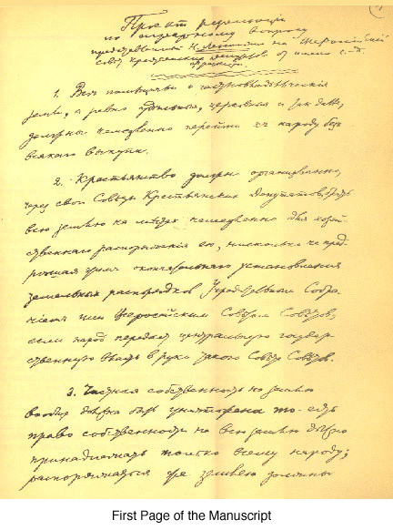 2) The peasantry must in an organised manner, through their Soviets of Peasants’ Deputies, immediately take over all the land in their localities for the purpose of its economic exploitation, without however in any way prejudicing thereby the final establishment of land regulations by the Constituent Assembly or by the All-Russia Council of Soviets, should the people decide to vest the central power of the state in such a Council of Soviets.