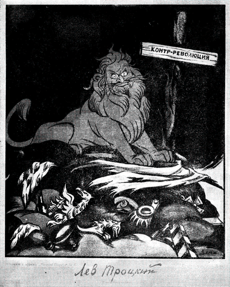 Reproduction of a Soviet painting which shows Leon Trotsky (depicted as the raging red lion) in the act of destroying the counter-revolution (depicted, in part, as the dead eagles of Czarism). Note the silk hat of the bourgeoisie among the welter of Czarist insignia. The post-sign reads “Counter-Revolution.” The name of the artist is Deni. In Lenin’s lifetime, the propaganda departments of the Soviet government, of the Russian Bolshevik Party and of the Communist International frequently used this and similar representations of Trotsky in order to symbolize the revolution’s triumph in the Civil War of 1918-21. It was thought to be of especial importance to the youth. The colored print, of which our cut is a copy, was bound in as a supplement to the April 1922 issue of Molodaya Gvardia (Youth Guard), one of the early theoretical and cultural magazines of the Russian Communist youth movement.