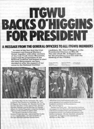 The ITGWU’s connections with the government, through the Labour Party, are many and close. The Minister for Labour, Michael O’Leary, who has the main responsibility for liaison with the unions, is a former officer of the union. The support of the ITGWU bloc at the Labour Party conference has also made him Financial Secretary of the party. Several other Labour ministers and deputies, including the leader of the party and Deputy Prime Minister (Tanaiste), Brendan Corish, are members of the union and use their nominal membership as a platform to preach restraint and repression. Local ITGWU offices provide many Labour deputies with a convenient permanent base. The union provides the main financial support for the Labour Party as well as paying election expenses for a number of condidates. Many of those candidates, indeed, are full-time officials or long-standing lay officers of the union. However, the ITGWU has no control over the voting record of the sponsored deputies. Michael Mullen had the support of the NEC, for instance in opposing the Criminal Law (Jurisdiction) Bill, but the union did not try to get other members or officials to take the same stand, and could do nothing to prevent the party whip being withdrawn from him.