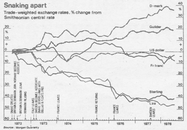 The chart shows the enormous variations in the exchange rates since the last ill-fated attempt to link the EEC currencies in the “snake”. In the last three years, the inflation rate has been 10% higher on average in Italy than in Germany – hardly a convincing basis on which to link the currencies!
