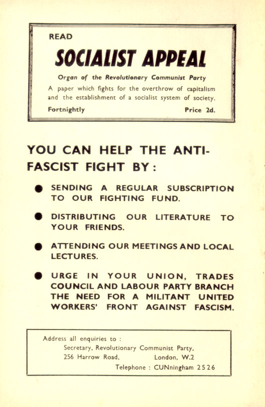 The Revolutionary Communist Party has been active in demonstrating and attempting to combat the fascists wherever they have appeared. We wrote to Harry Pollitt appealing for a united front against the fascists. The London District Committee of the RCP sent a similar appeal to the London CP and YCL leaderships. The essence of our position can be summed up in the following extract from the letter sent by the London District Committee to the London District Committee of the Communist Party: