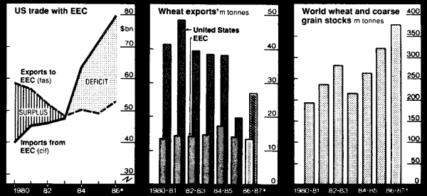 The problem is getting desperate as farmers produce more and more on both sides of the Atlantic. World grain stocks – now about 375 million tonnes – have increased 50 percent since 1984 (you thought there were famines!). US exports of wheat, peaking at 50 million tonnes in 1981, were under 20 million in 1985.
