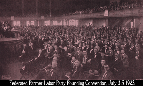“The Federated Farmer-Labor Party,” by William Z. Foster. [August 1923] This long day-by-day account of the founding convention of the Federated Farmer-Labor Party (July 3-5, 1923) was written in the immediate afterrmath of the gathering by William Z. Foster. This piece, published in the pages of the monthly magazine of the Trade Union Educational League, is gushingly upbeat and positive in its characterization of the founding convention: “Marked by a tremendous outburst of militancy and enthusiasm, it was a vibrant, thrilling, overwhelming demand by the rank and file of agricultural and industrial labor for the formation of a powerful political party of the toilers. Nobody who attended its sessions will ever forget them.” While Foster would very soon come to regard the WPA’s ideologically blinkered Farmer-Labor Party policy and TUEL’s subsequent loss of contacts and influence in the labor movement as the greatest of debacles—fuel for the factional war inside the Workers Party over the next several years—at this precise moment he was positively ebullient about the organization’s prospects, it’s founding marking a new epoch in American political history: “A mass party, led by militants, embodying the vital idea of a united political organization of workers and farmers, and operating in the midst of the present industrial and agricultural discontent, it is full of dynamic possibilities,” Foster declared. Foster dismissed the “supposed [old] Farmer-Labor Party bolt” as a “lie widely spread,” and he asserted that “the fact is that the most militant elements in the FLP, carrying with them the bulk of the organization, have declared for the new party.”