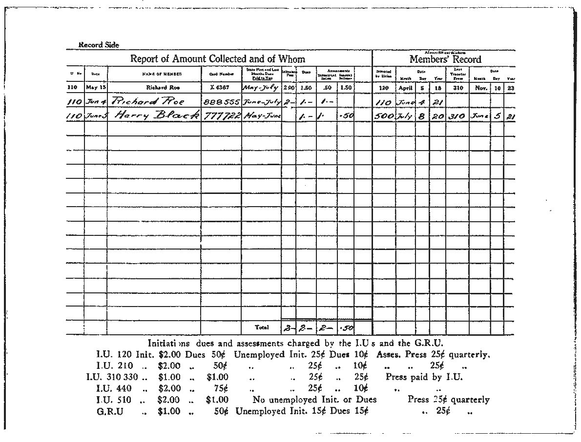 In making out your report, total up the amount of initiation fees, the total amount of dues and the amount, of Press General Defense and Organization stamps. now transfer the totals to the summary side.
