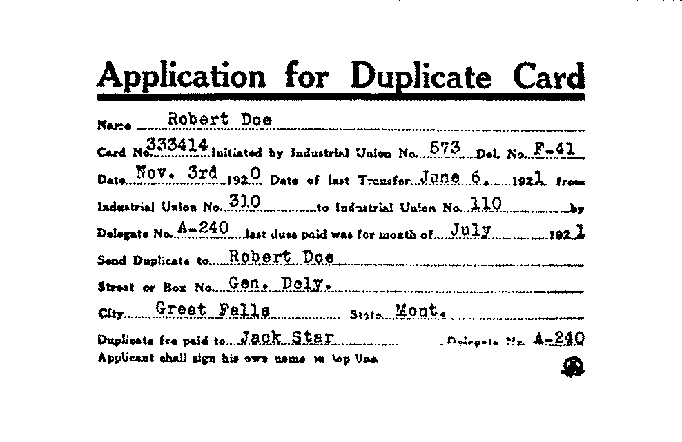 On the next page you will see an application for duplicate card. Study it carefully! After having the member write his name on the top line, get his card number. Be sure to get his correct number, as it is more important than the name; there are quite a few names alike, but the numbers never are. Then get the Union he was initiated in, what time and the delegate number of who initiated him; also, the last transfer and the number of the Industrial Union to which he transferred—and for what month the last dues were paid for, and what delegate number collected same. Then, put down where to send the duplicate card; and last, to whom the 50¢ was paid and the delegate number.