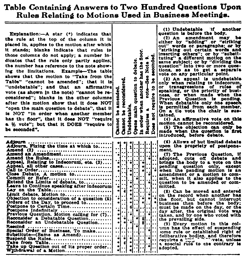 New business. The frist thing coming up under new business is that which was laid over from the different points of order. A motion is now made and seconded as to what to do with it, after the recording lecretary has written it down and read it, the floor is thrown open for discussion. After all who wish to speak on the motion have been heard. the motion is voted upon. After all matters laid over have been acted upon, motions are in order for any business that may happen to come up.