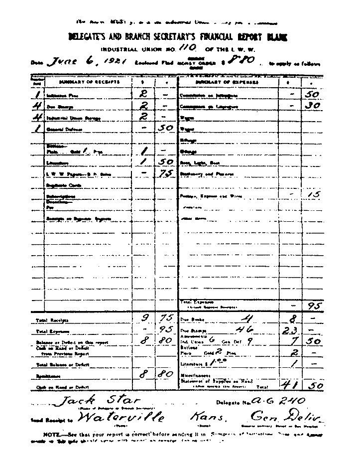 Note: Always put the total amount of literature and papers sold on the receipt side, for instance "Literature" $1.50. "I.W.W. Papers" 75¢. and place the amount of commission on the expense side. Note: The commission on literature and papers are the same. 40 per cent (40%) and which is added together to get the commission.