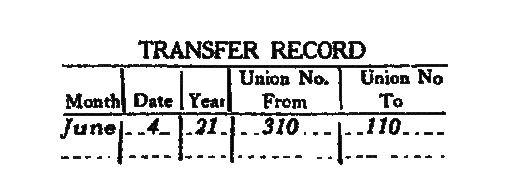 When transferring a member from one union to another, place the month, day and year of the transfer, and the union he is transfering from and the union he transfers to, in the proper places, in the members due book, be sure to sigin your name and delegate number.