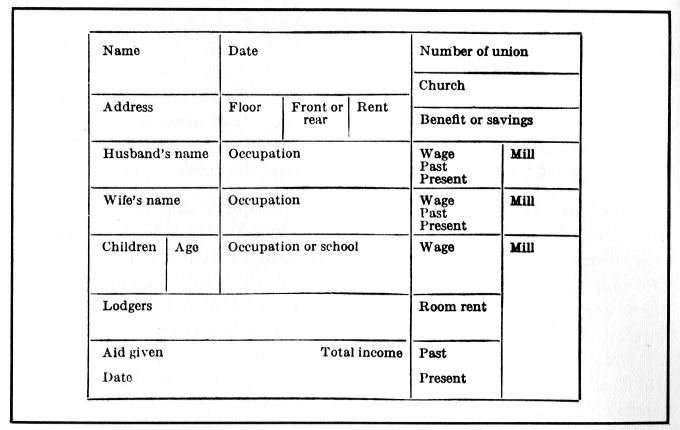 Under its auspices, a relief station was established at the headquarters of the Central Labor Union. Milk and bread, and also shoes and other articles of clothing, were distributed directly to applicants from this relief station. A record was made of each applicant and the membership of the family wherever assistance (other than milk) was requested. A sufficient investigation was made to determine the need of such applicants for aid, and the information gathered was assembled on a card containing the following items: