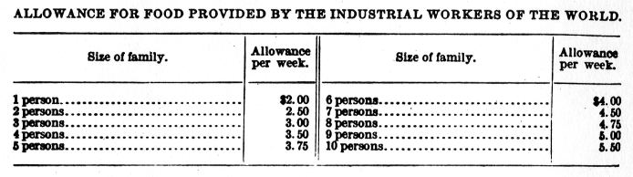 The Industrial Workers of the World provided a weekly allowance for food based on the number in each family. The allowance was as follows: