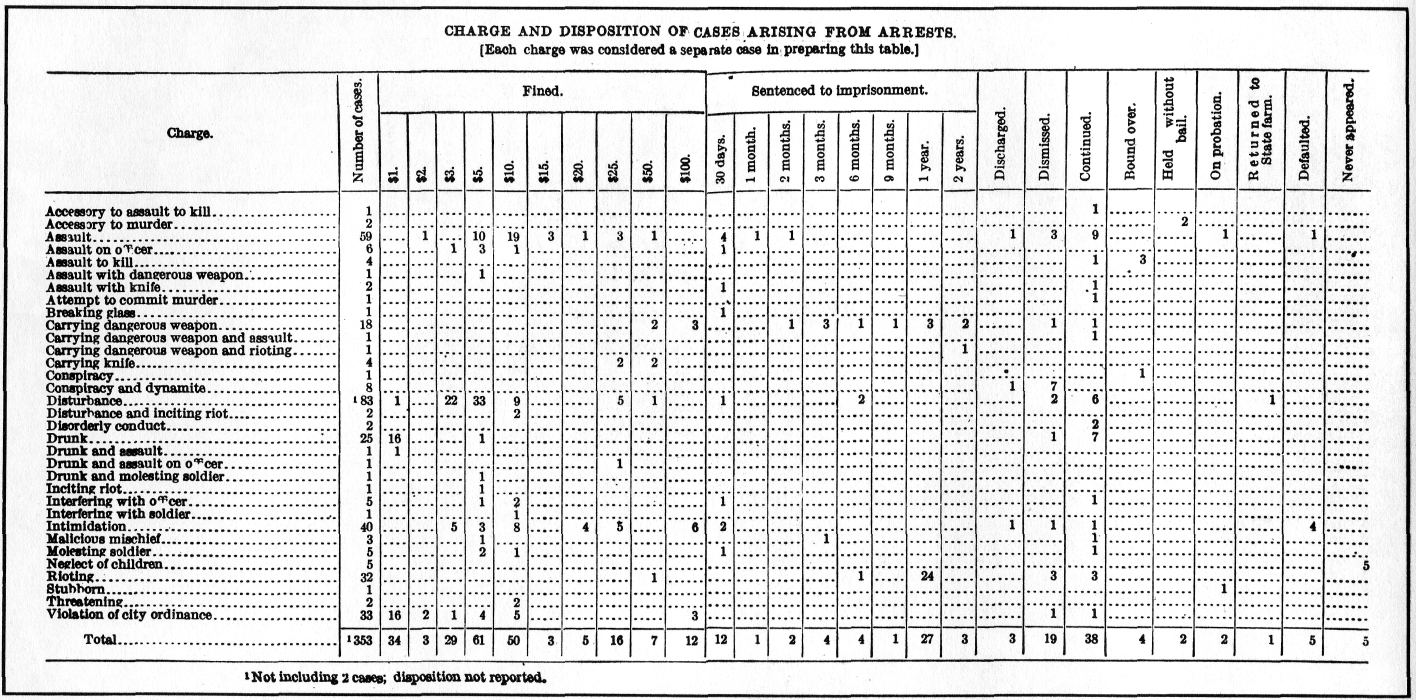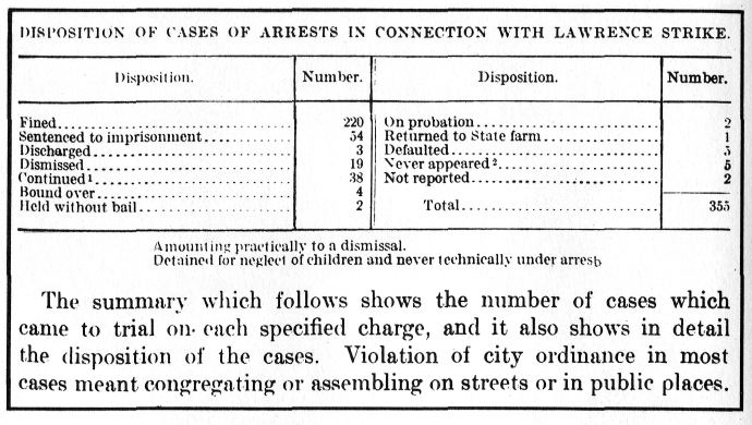 During the period from January 12 to March 13, inclusive, the number of arrests arising from the Lawrence strike was 296. This number includes the 5 detained for neglect of children'' on February 24 these persons were never technically under arrest. More than 291; arrests were made during the period indicated above, but only 296 attests were of strikers, or persons connected with the strike, or in any way grew out of the strike, in many instances when a person was arrested more than one charge was placed against him, and when the matter cane before the court the charges were disposed of separately: thus one, of the persons arrested on January 15 was charged with rioting and also with carrying a dangerous weapon; on the first charge lie was sentenced to one year's imprisonment and on the second charge to six months' imprisonment.