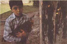 A boy carries a cockerel which will be sacrificed because his families prayers were answered. (1980s) |