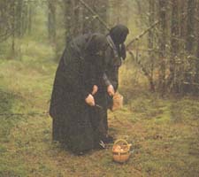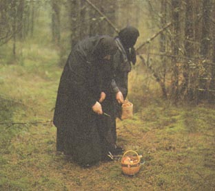 | In the Convenant of the Assumption, a nun prays in her room. | Self-sufficient nuns gather wild mushrooms. |
