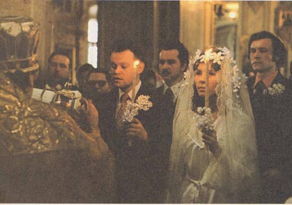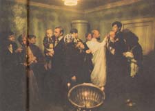| A baptized child is given a tonsure. | A wealthy bishop, who owns a chauffeur-driven limousine, welcomes guests for tea. |