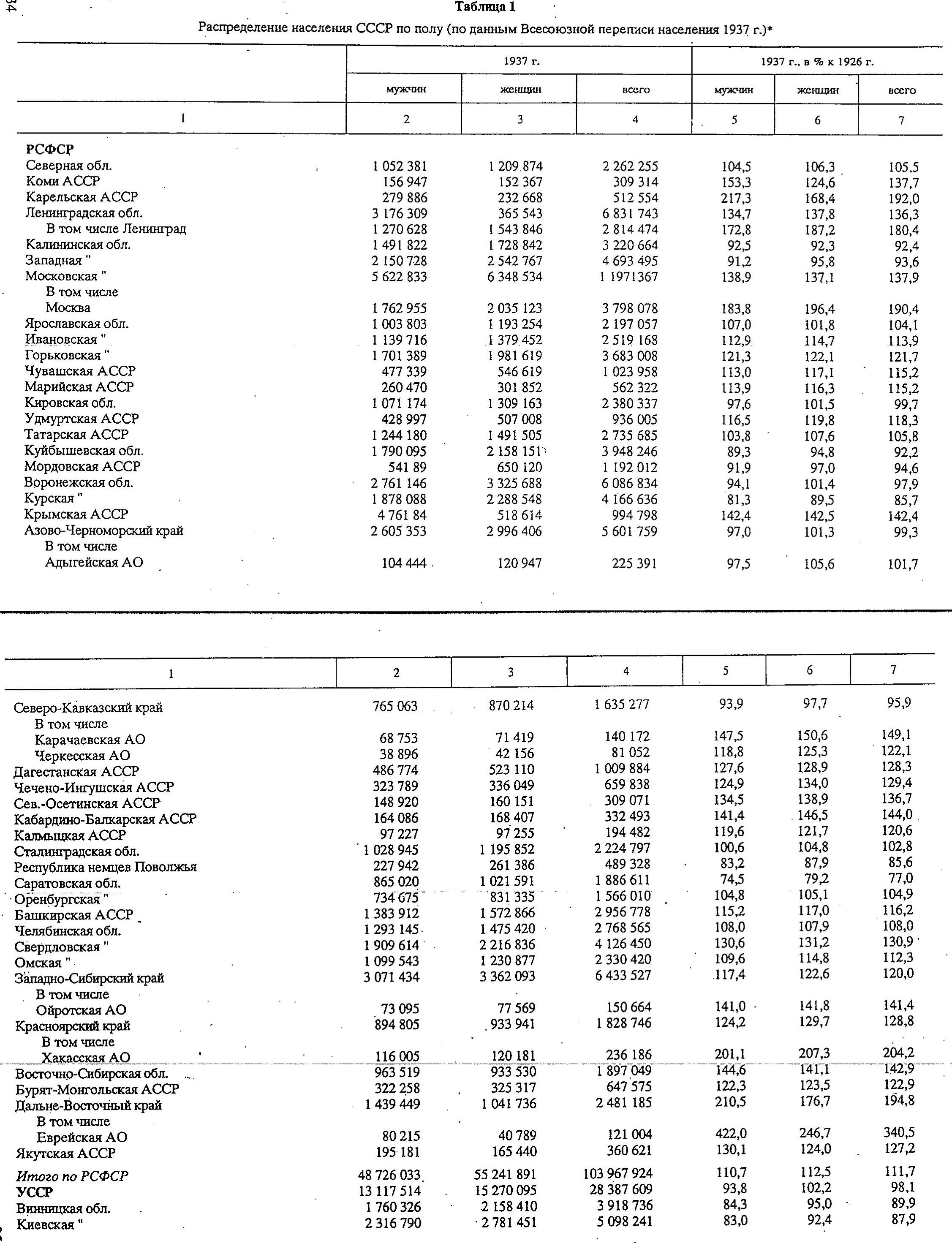 USSR Population Distribution (USSR Population Census 1937) 1937 g. 1937 g., in % k 1926 g. Region Men Women Total Men Women Total RSFSR Northern Oblast 1,052,381 1,209,874 2,262,255 104.5 106.3 105.5 Komi ASSR 156,947 152,367 309,314 153.3 124.6 137.7 Karelian ASSR 279,886 232,668 512,554 217.3 168.4 192.0 Leningrad Oblast 3,176,309 365,543[A] 6,831,743 134.7 137.8 136.3 including Leningrad 1,270,628 1,543,846 2,814,474 172.8 187.2 180.4 Kalinin Oblast 1,491,822 1,728,842 3,220,664 92.5 92.3 92.4 Western Oblast 2,150,728 2,542,767 4,693,495 91.2 95.8 93.6 Moscow Oblast 5,622,833 6,348,534 11,971,367 138.9 137.1 137.9 Including Moscow 1,762,955 2,035,123 3,798,078 183.8 196.4 190.4 Yaroslavl Oblast 1,003,803 1,193,254 2,197,057 107.0 101.8 104.1 Ivanovo Oblast 1,139,716 1,379,452 2,519,168 112.9 114.7 113.9 Gorki Oblast 1,701,389 1,981,619 3,683,008 121.3 122.1 121.7 Chuvashk ASSR 477,339 546,619 1,023,958 113.0 117.1 115.2 Mari ASSR 260,470 301,852 562,322 113.9 116.3 115.2 Kirov Oblast 1,071,174 1,309,163 2,380,337 97.6 101.5 99.7 Udmurt ASSR 428,997 507,008 936,005 116.5 119.8 118.3 Tatar ASSR 1,244,180 1,491,505 2,735,685 103.8 107.6 105.8 Kuybyshev oblast 1,790,095 2,158,151 3,948,246 89.3 94.8 92.2 Mordvinian ASSR 54,189[B] 650,120 1,192,012 91.9 97.0 94.6 Voronezh oblast 2,761,146 3,325,688 6,086,834 94.1 101.4 97.9 Kursk oblast 1,878,088 2,288,548 4,166,636 81.3 89.5 85.7 Crimean ASSR 476,184 518,614 994,798 142.4 142.5 142.4 Azov-Black Sea 2,605,353 2,996,406 5,601,759 97.0 101.3 99.3 Including Adygeyskaya AO 104,444 120,947 225,391 97.5 105.6 101.7 North-Caucasian 765,063 870,214 1,635,277 93.9 97.7 95.9 Including Karachayevskaya AO 68,753 71,419 140,172 147.5 150.6 149.1 Cherkesseaya AO 38,896 42,156 81,052 118.8 125.3 122.1 Daghestan ASSR 486,774 523,110 1,009,884 127.6 128.9 128.3 Checheno-Ingush ASSR 323,789 336,049 659,838 124.9 134.0 129.4 North-ossetic ASSR 148,920 160,151 309,071 134.5 138.9 136.7 Kabardino-Balkarskaya ASSR 164,086 168,407 332,493 141.4 146.5 144.0 Kalmik woman ASSR 97,227 97,255 194,482 119.6 121.7 120.6 Stalingrad oblast 1,028,945 1,195,852 2,224,797 100.6 104.8 102.8 German Republic of Volga 227,942 261,386 489,328 83.2 87.9 85.6 Saratov 865,020 1,021,591 1,886,611 74.5 79.2 77.0 Orenburg oblast 734,675 831,335 1,566,010 104.8 105.1 104.9 Bashkir ASSR 1,383,912 1,572,866 2,956,778 115.2 117.0 116.2 Chelyabinsk oblast 1,293,145 1,475,420 2,768,565 108.0 107.9 108.0 Sverdlovsk oblast 1,909,614 2,216,836 4,126,450 130.6 131.2 130.9 Omsk oblast 1,099,543 1,230,877 2,330,420 109.6 114.8 112.3 Western Siberia 3,071,434 3,362,093 6,433,527 117.4 122.6 120.0 Including Oirot AO 73,095 77,569 150,664 141.0 141.8 141.4 Krasnoyarskiy Kray 894,805 933,941 1,828,746 124.2 129.7 128.8 Including Khakass AO 116,005 120,181 236,186 201.1 207.3 204.2 Eastern Siberia oblast 963,519 933,530 1,897,049 114.6 141.1 142.9 Bore-Mongolian ASSR 322,258 325,317 647,575 122.3 123.5 122.9 Far-Eastern Kray 1,439,449 1,041,736 2,481,185 210.5 176.7 194.8 Including Jewish AO 80,215 40,789 121,004 422.0 246.7 340.5 Yakutskaya ASSR 195,181 165,440 360,621 130.1 124.0 127.2 Total RSFSR 48,726,033 55,241,891 103,967,924 110.7 112.5 111.7 Ukrainian SSR 13,117,514 15,270,095 28,387,609 93.8 102.2 98.1 Vinnitsa oblast 1,760,326 2,158,410 3,918,736 84.3 95.0 89.9 Kiev oblast 2,316,790 2,781,451 5,098,241 83.0 92.4 87.9