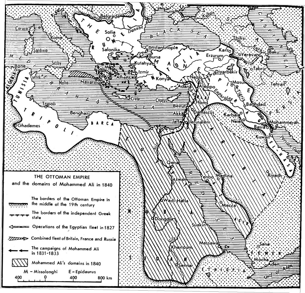 The Turco-Egyptian war resulted in the formation of two states within the framework of the formally united Ottoman Empire. Mohammed Ali exercised control over Egypt, the Sudan, Syria, Palestine, Arabia, Cilicia and Crete, and only Anatolia, Iraq and a few regions of the Balkan Peninsula remained in the hands of the Sultan. Mohammed Ali’s empire was more densely populated, vaster, stronger and riche]than that of Mahmud II. The situation was fraught with a new conflict which was not long in making itself felt.