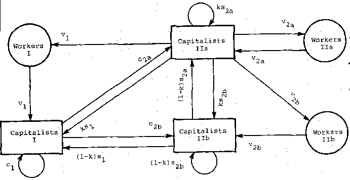 A word should be said about the arrow from capitalists in Department I to themselves: at first glance this relation seems paradoxical, until we recall that capitalists producing new means of production themselves employ means of production, which must be bought from other capitalists in their department. (In certain special circumstances capitalists may in fact employ part of their own product to furnish new means of production -e.g., seed in agriculture -- but these are exceptional cases.) A similar comment applies to the self-directed arrow for capitalists in Department II: they purchase articles of consumption from each other.