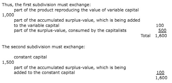 Just as in simple reproduction, the second subdivision must exchange its constant capital-equal to 1,500-with the first and the first subdivision must exchange with the second its variable capital, equal to 1,000 and the part of its surplus-value consumed by the capitalists, equal to 500..