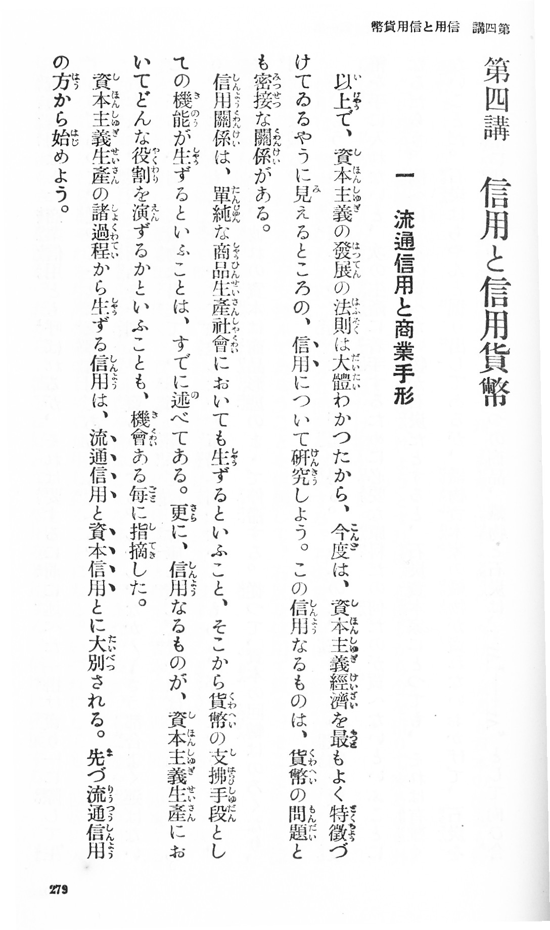 Those accepting banknotes from a bank first of all accept them as a certificate of trust. But it is because commercial bills and checks accepted as certificates of credit re-circulate to take the place of money, that banknotes also pass from hand to hand to re-circulate and take the place of money. The characteristics of banknotes, as an instrument of credit, is first that they do not have to be endorsed; second that there is no designated payment date, so that they can at any time be exchanged for gold coins; third that its denominations are not fractions but 1-yen, 5-yen, 10-yen etc.; and fourth that one only has to deal with banks which have a great deal of trust. These are the reasons that banknotes can also enter general circulation to take the place of money. First and foremost, they can take the place of money in the function of means of circulation, and further, if the trust in the bank is not shaken, they can take the place of money in the function as means of payment.